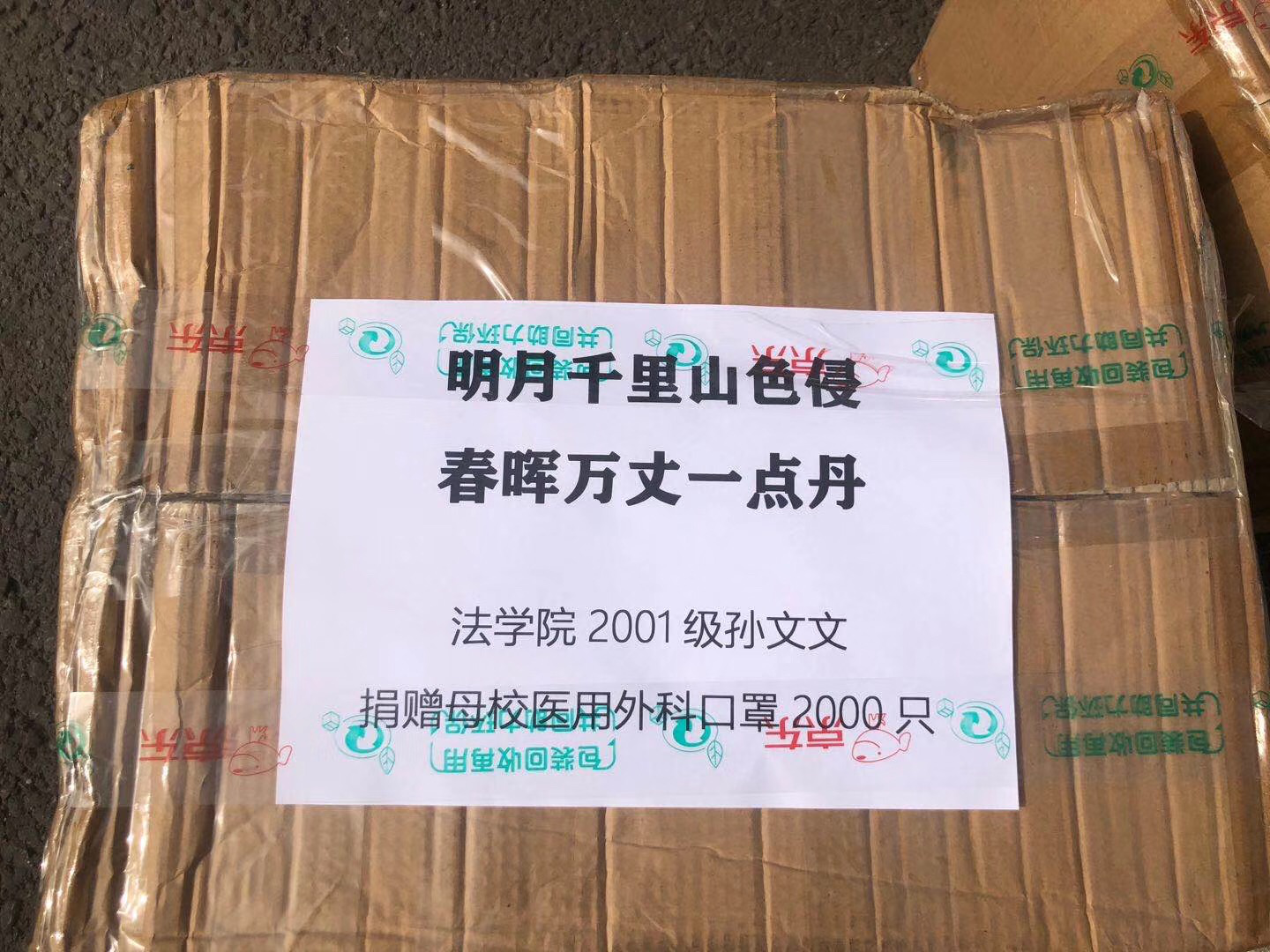 2月27日下午,由兰州大学法学院2001级院友孙文文捐赠的2000只医用口罩顺利运抵兰州大学保卫处,据悉,这批口罩将全部用于我校安保人员日常防护。而在这批口罩顺利抵达母校的背后,是一段跨越半个地球的感人故事。