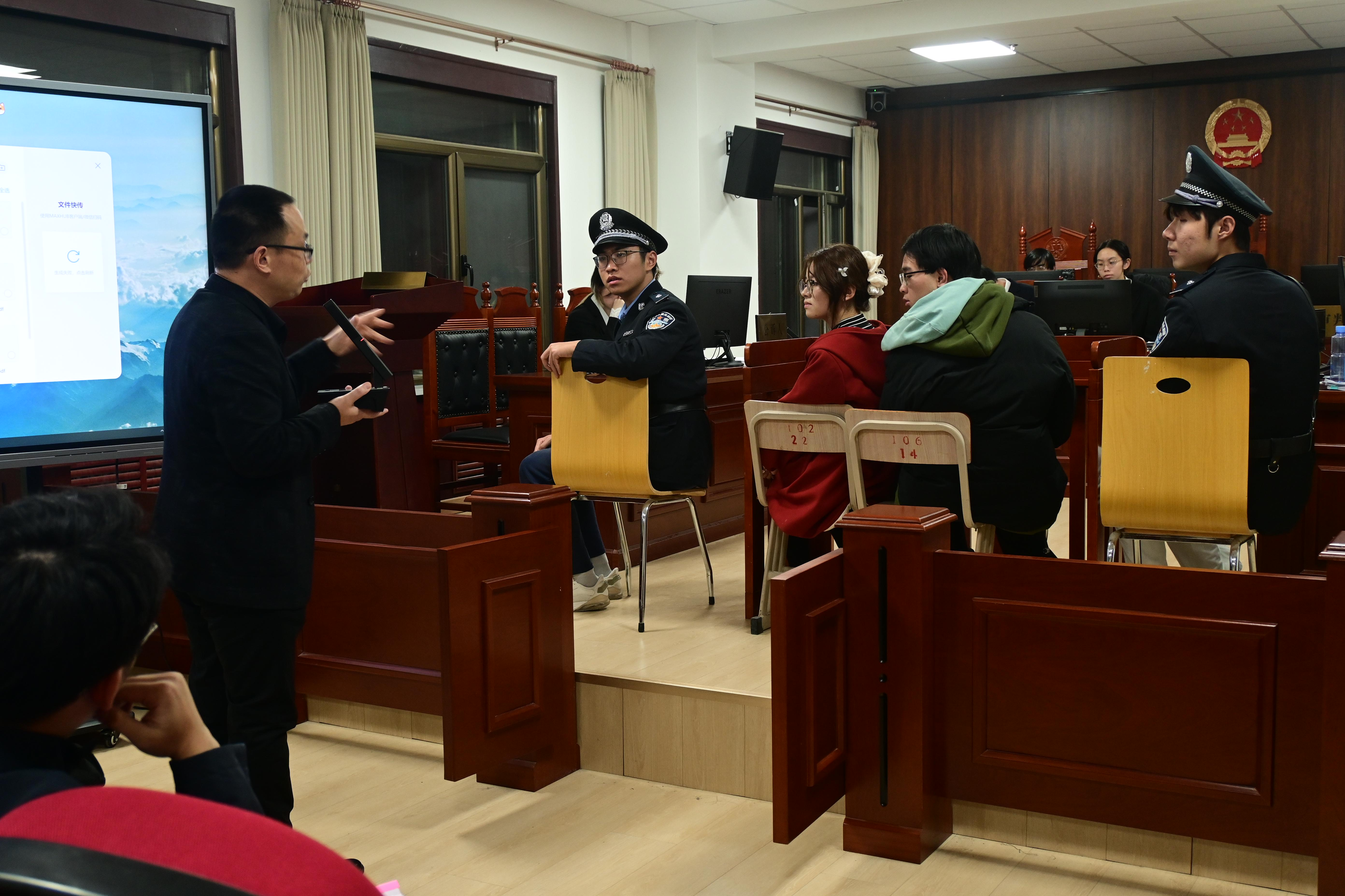 备赛阶段,各小组通力协作。王欣带领11人取证组细致梳理线索,全面搜集、核实证据,最终形成详实、规范的侦查卷宗,夯实庭审证据基础;吴一欧等6人组成的备勤组提前制定应急方案,备赛时随时应对突发情况,在庭审中化身法警维护秩序,保障流程顺畅;白韵琦等6人组成的证鉴组协调证人准备证言,规范鉴定流程,让证言与鉴定意见互补;汤晨曦带领文宣组4人记录庭审精彩瞬间,制作海报与案情视频,庭审前后,他们以主持人身份衔接环节,留存生动记忆。正是全体同学各司其职、紧密协作,这场“实战”模拟审判才圆满落幕。