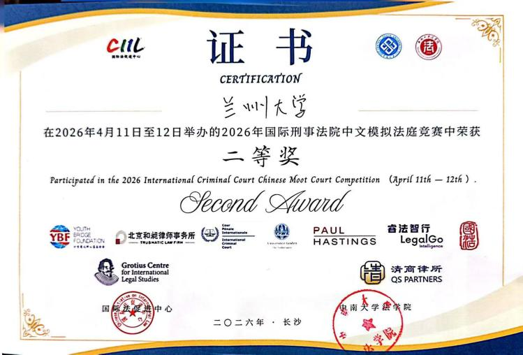 4月11日至12日,国际刑事法院中文模拟法庭竞赛(ICC中文赛)正赛在中南大学落幕。ICC中文赛是经国际刑事法院官方授权、全球唯一以中文为比赛语言的顶级国际法模拟法庭赛事,也是我国涉外法治人才培养领域的重要专业学术平台。本届比赛共有来自全国各地的130支高校代表队参赛,参赛规模创历史新高,兰州大学法学院代表队脱颖而出,斩获全国二等奖,创下我校参加该项赛事以来的历史最佳成绩。